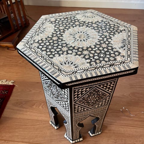 Detta är egyptiskt, marockanskt sidobord i bokträ med pärlemorinläggningar.