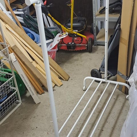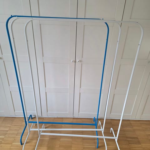 Rejäl klädställning i asymmetrisk design i krom på hjul. Rymmer hur mycket som helst och är superstark samt har möjlighet att låsa hjulen. Vid snabb affär kan priset diskuteras något.