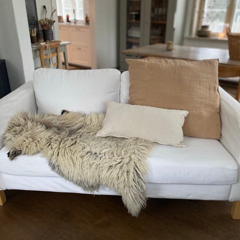 Inköpt från Ilva för 10+ år sedan men fortf fin. Superskön och en riktig djup och mysig soffa att krypa upp i. Två kuddfodral kommer också med och det går att tvätta rygg- och sittkuddarna.