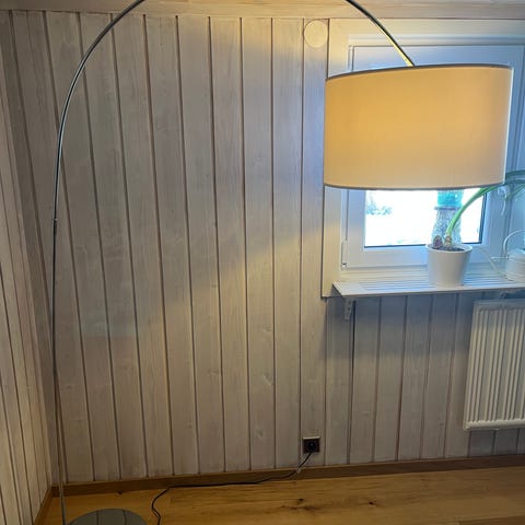 Snygg och pampig båglampa som blir ett blickfång i rummet. Ger ett mjukt och behagligt sken över soffbordet eller läshörnan. Kraftig och tung fot som gör att den står stadigt trots sin storlek.