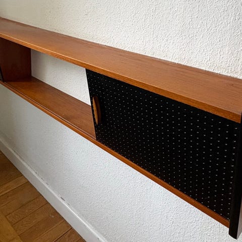 Möblerna är i bruksskick med åldersrelaterat slitage. Stabil konstruktion och fin teakton. Passar bra som bokhyllor, förvaring eller möbel i vardagsrum eller kontor.