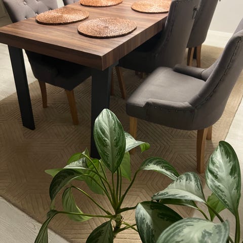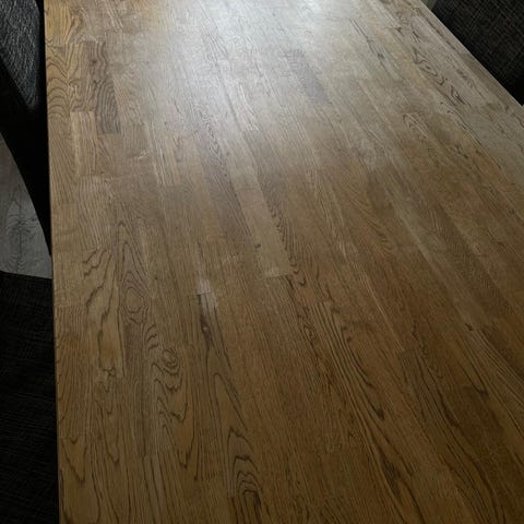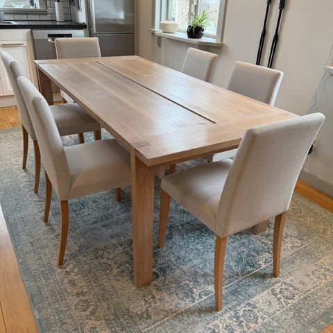 Snyggt, stilrent och stabilt Ek matbord med sex stolar
