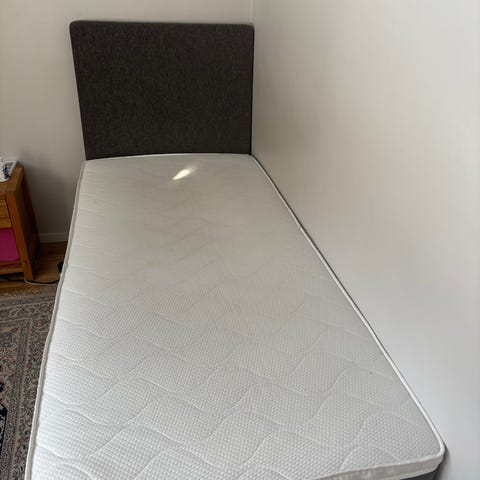 KungSängen Lindenäs S13 ramsäng med sänggavel i storlek 105x200 cm. 25 års garanti. Fasthet medel. Sängen har grått tyg på resårbotten och sänggavel samt metallben. Madrassen är vit med quiltad ovansida. Passar som enkelsäng i sovrum, gästrum eller tonårsrum. Nypris 8785 kr 2020.