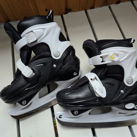 Svarta och turkosa skridskor i justerbar storlek 35-38. Märke Graf. Dessa har synliga slitage men är fullt användbara. Pris: 200 kr inklusive skridskoskydd.