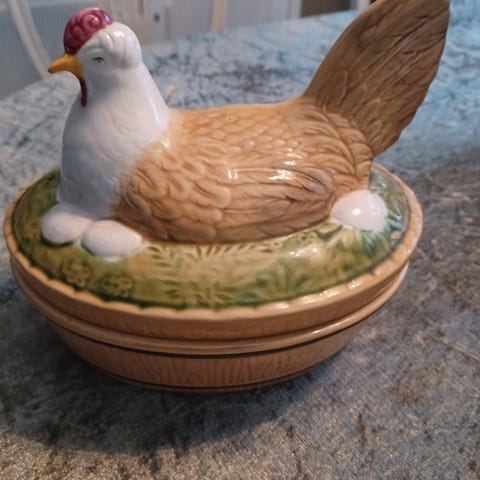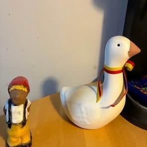VALLIS Keramika prydnadsgås i vit keramik. Figuren föreställer en gås med detaljerad fjäderstruktur och står på en brun fot. Halsen är dekorerad med ett band i blått och gult. Passar som inredningsdetalj i fönster, på hylla eller bord.