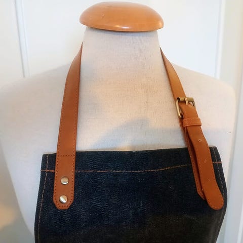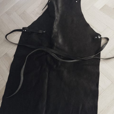 Förkläde i brunt läder med tillhörande grytvante. Förklädet har två framfickor och justerbart nackband med remmar som knyts i ryggen. Insidan är klädd i rutigt tyg. Passar för matlagning, grillning eller annat arbete där skydd av kläderna behövs.