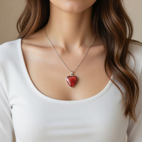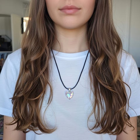 Halsband med ett hjärtaformat hänge i flera färger. Kedjan är silverfärgad. Längd 45 + 5 cm. Berlock 2×2 cm.