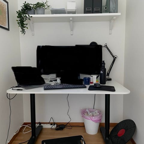 Skrivbord med vit bordsskiva i glas och underrede i metall. Rakt, rektangulärt bord som passar som arbetsbord eller datorbord i hemmet eller på kontoret. Bordet har slanka ben och en enkel konstruktion som ger gott om benutrymme under skivan.