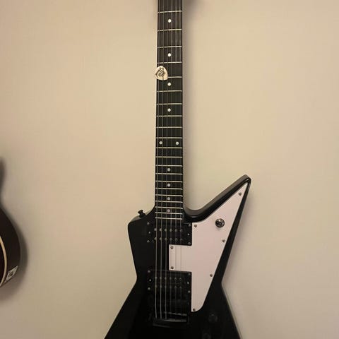 Elgitarr som passar barnhänder. Den är strängad och intonerad med 12-56 för att kunna stämmas i E. Fanns inget intresse att bli gitarrhjälte... 8^)