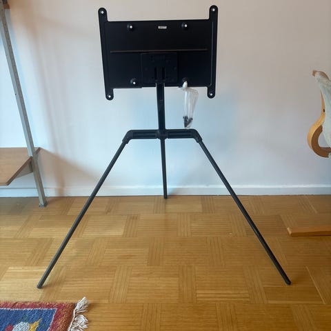 Samsung Studio Stand TV-stativ i svart utförande. Golvstativ med trebensdesign för montering av kompatibla Samsung-TV-apparater. Stativet är avsett för att placeras fritt i rummet och ger möjlighet att justera TV:ns höjd och vinkel enligt tillverkarens anvisningar. Levereras i originalkartong enligt bilderna.