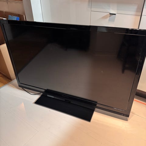 Grundig tv. Platt tv för hemmabruk, lämplig för placering på tv-bänk eller liknande möbel. Anslutningskabel syns på bilden.