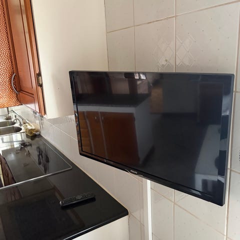 Samsung tv-skärm i vit färg. Modellen har inbyggda anslutningar på baksidan, inklusive HDMI, VGA, SCART och komposit/ljud-ingångar. Skärmen levereras med fjärrkontroll och strömkabel enligt bild. Passar som tv eller extern bildskärm beroende på anslutningsbehov.