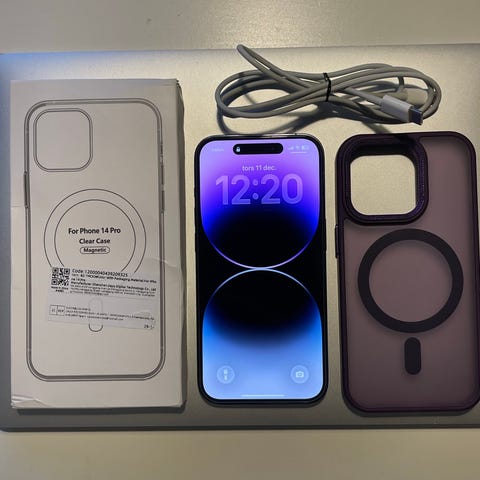 Apple iPhone 14 Pro smartphone med 128 GB intern lagring. Modellen har trippelkamera på baksidan och skärm med helframsidesdesign. Enheten på bilderna visas tillsammans med originalförpackning och USB‑C till Lightning‑kabel. Lämplig för vardagsanvändning, surf, foto och video.