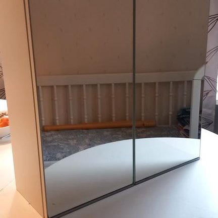 Auli skjutdörrar 75 cm styck till 150 × 201 hög med spegeldörr parti komplett med lister och skruvar blev 2 skador vid nedplockning finns på bild inre partiet