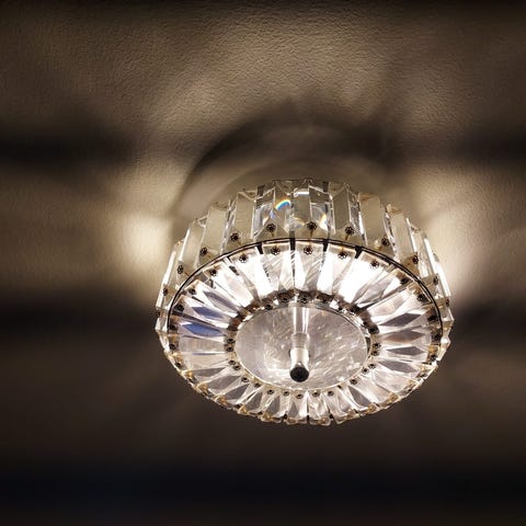 Mio 4 taklampor. Lampan är en rund plafonmodell med kromfärgad takplatta och hängande klara prismor/kulor i flera nivåer. Passar som allmänbelysning i exempelvis hall, sovrum eller vardagsrum. Lampan monteras direkt i taket.