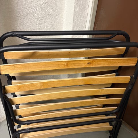 IKEA gästsäng med madrass. Sängen har en blå metallram med ribbotten och en madrass med randigt överdrag. Fällsängen är försedd med hjul för enkel förflyttning och kan fällas ihop för platsbesparande förvaring. Lämplig som extrasäng i hemmet eller för gästrum.