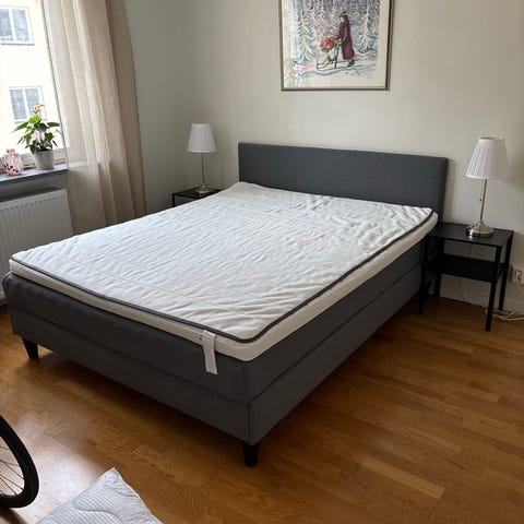 Mio sänggavel i grått tyg. Gaveln har raka, enkla linjer och står på ben. Passar som huvudgavel bakom säng i sovrum. Exakta mått och modellbeteckning är okända, men gaveln är avsedd att placeras mot vägg bakom en sängram eller resårmadrass.