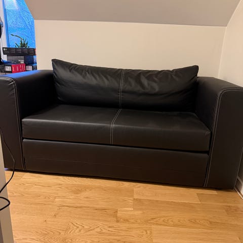 En liten bäddsoffa i konstskinn som är enkel att möblera med om du har begränsat utrymme.