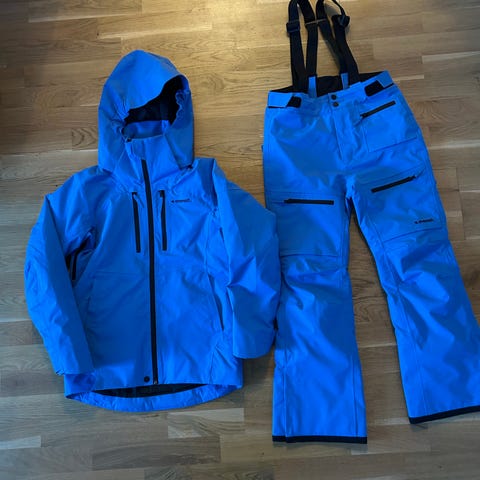Varm jacka med alla funktioner som krävs i skidbacken. Tillhörande täckbyxor i samma höga kvalitet. Byxorna är lite slitna i nedre kanten bak.