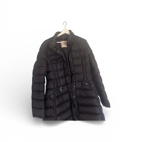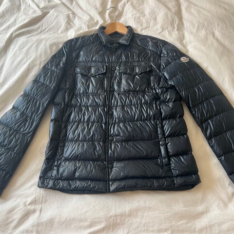 Mörkblå dunjacka av märke Moncler, modell ’Ever’ , i fint skick. Stl. 4, sägs motsvara en L men passar också en M.