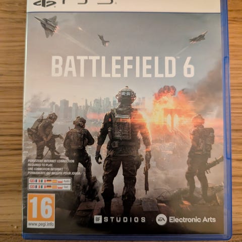 Battlefield 6 Playstation 5 spel. Fysiskt spel på skiva i blå PS5-fodral. PEGI 16-årsgräns. För en spelare eller flerspelarläge beroende på spelsätt och inställningar. Avsett för Playstation 5-konsol.