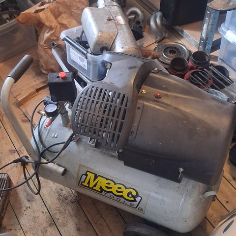 Jun-Air tyst kompressor med tryckregulator och manometrar. Utrustad med bärhandtag och anslutningar för tryckluftsslang, inklusive spiralformad slang. Passar för olika tryckluftsverktyg och enklare verkstads- eller hobbyarbeten där komprimerad luft behövs.