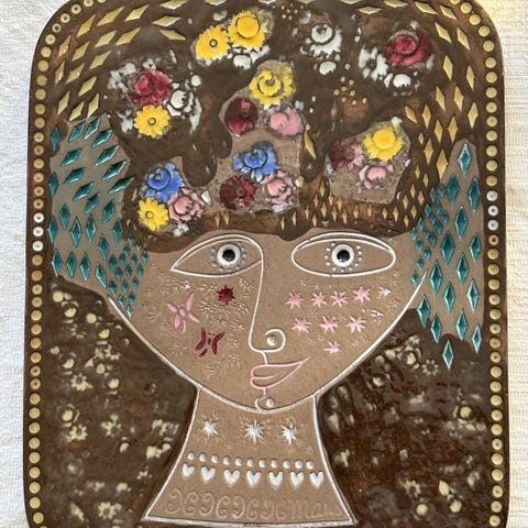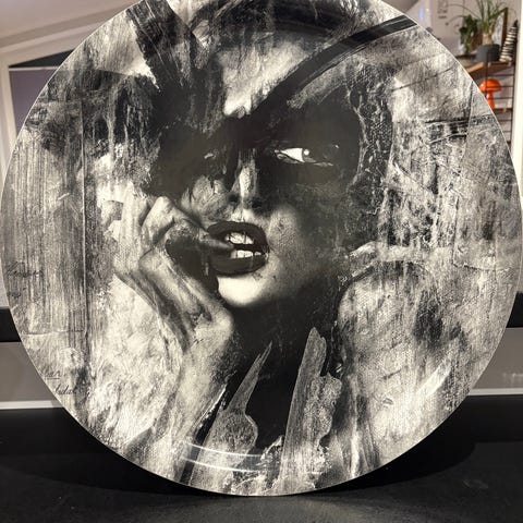 Gynning Design tallrik med runt format och konstnärligt motiv av kvinna i flerfärgstryck.