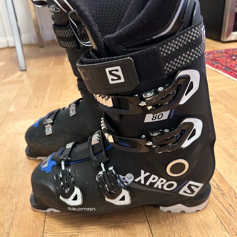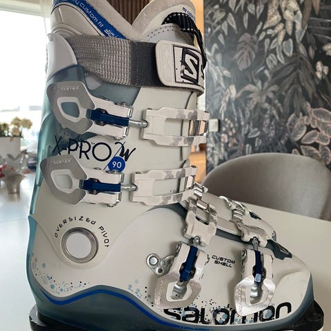 Salomon S/Pro Sport 90 W alpinstövlar för dam i storlek 23,5 (mondo 23/23,5). Pjäxorna är svarta med vita detaljer och har fyra justerbara spännen samt powerstrap upptill. Flexindex är 90 och lästen är 100 mm, vilket ger en kombination av stöd och komfort. Modellen är avsedd för alpin skidåkning i pist och fungerar för medelgoda till avancerade åkare som vill ha en stabil och responsiv pjäxa.