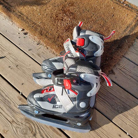 Justerbara hockeyskridskor för barn storlek 28 till 31. Thinsulate innermaterial som håller foten varm. Skridskorna är svarta med vitt skenstativ och justerbara spännen/klicklås och kardborreband. Hämtas i vallentuna.