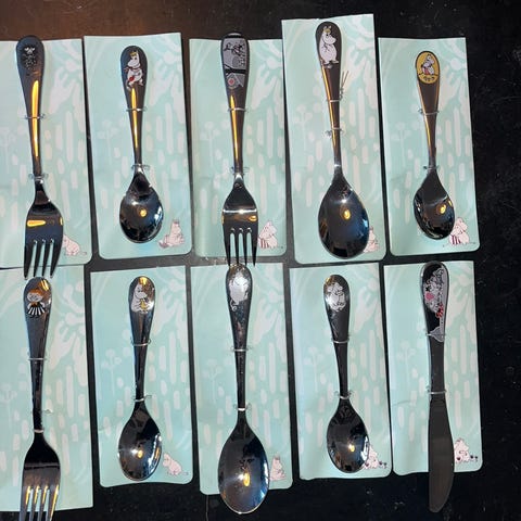 Hackman Moomin Family barnbestick i rostfritt stål. Bestickset med motiv från Mumintrollen, utformat för barn. Setet innehåller två skedar, en gaffel och en kniv anpassade för mindre händer.