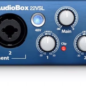 Presonus AudioBox One 24-bitars USB 2.0 ljudinterface med USB-anslutning för PC och Mac. Enheten har kombinerad mikrofon-/instrumentingång på framsidan, hörlursutgång samt reglage för nivå och mix. På baksidan finns USB 2.0-port för ström och data, extra USB-port märkt Device samt två balanserade huvudutgångar (Main). Kapsling i silverfärgad metall med blå statuslampor på fronten. Lämplig för inspelning av sång, instrument och annan ljudinspelning till dator.