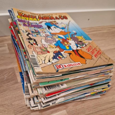Blandat parti serietidningar med titlarna 91:an, Knasen och Kalle Anka. Flera nummer i olika utgåvor och omslag, i färg och i tidningsformat. Passar för läsning, samling eller komplettering av befintlig serietidningssamling.