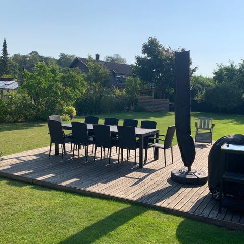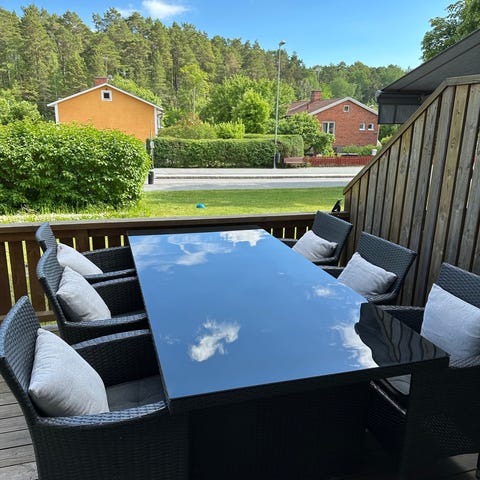 Utemöbelgrupp matgrupp i svart konstrotting bestående av bord, flera stolar med armstöd samt hörnsoffa/rak soffa. Möbelgruppen är avsedd för utomhusbruk på altan, uteplats eller trädgård och ger sittplatser för flera personer runt bordet. Bordsskiva och sitsar är anpassade för matplats utomhus och kan kombineras med dynor efter behov.