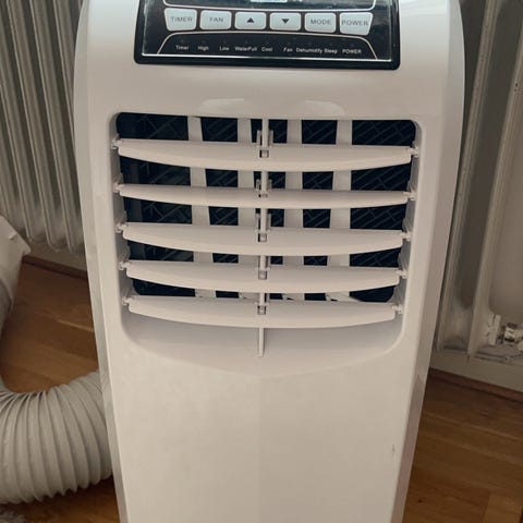 Portabel luftkonditionering i vit färg med svart toppanel. Enheten har frontgaller med justerbara lameller för luftutblås och är ansluten till en flexibel slang för varmluftsutsläpp genom fönster eller vägg. Ovanpå finns en digital kontrollpanel med knappar för olika funktioner och inställningar. Passar för inomhusbruk i bostad eller kontor där flyttbar kylning önskas. Dränerings- och ventilationsslang ansluts på baksidan av enheten.