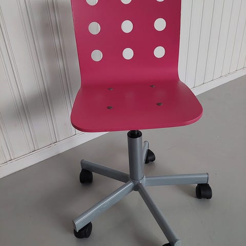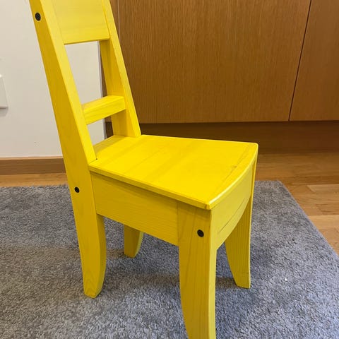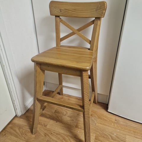 Barnstol i trä med brunlaserad yta. Stolen har rak rygg med tre lodräta ribbor och fyrkantigt säte. Passar som sittplats för barn i barnrum. Neutral träfärg som fungerar i många olika inredningsstilar.