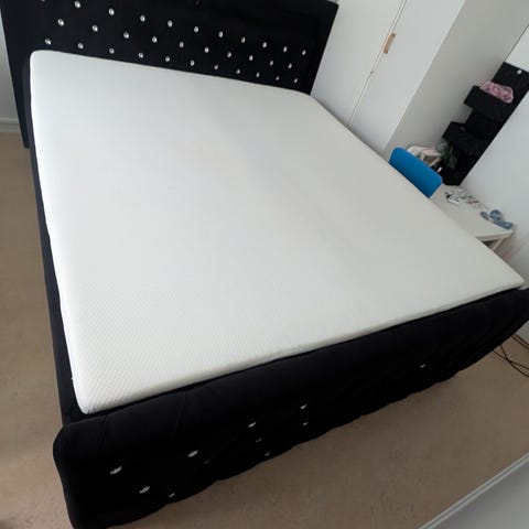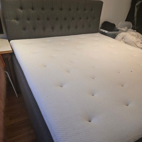 Mio säng med stoppad sänggavel i grått tyg.