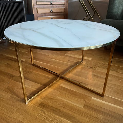 Runt soffbord i marmorglas och guld.