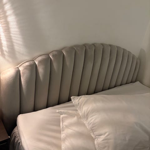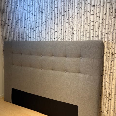 Mio sänggavel i grå textilklädsel. Gaveln har en vadderad, rut- och knappquiltad framsida som ger ett mjukt stöd bakom huvud och rygg. Passar till sängar i motsvarande bredd och kan placeras direkt mot vägg bakom sängen. Neutral grå färg som fungerar i många olika sovrumsmiljöer.