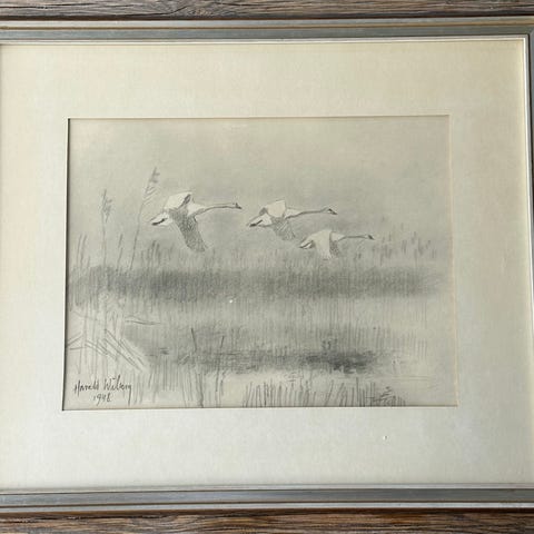 flygande svanar över ett skogs- och sjölandskap.