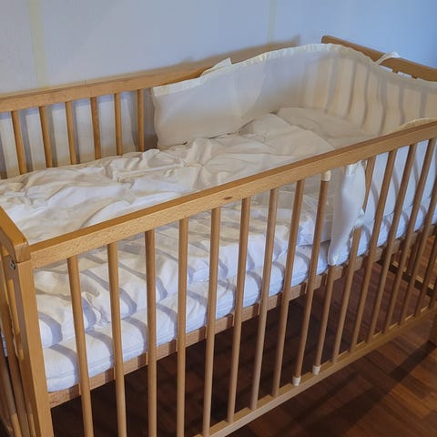 Skötbädd i vit färg. Fästes på en vägg. och kan fällas upp mot väggen så att det tar minimal plats. Består av en vadderad liggyta med upphöjda kanter samt en överdel i tyg som kan fällas över. Passar för inomhusbruk i hemmet, till exempel i barnrum eller badrum.