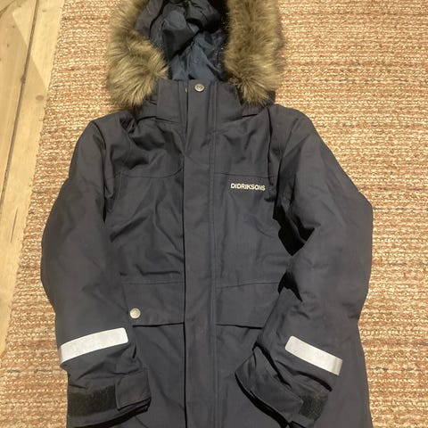 Blå fodrad parkas i ok skick. Vattentät och varm med snölås och andra praktiska detaljer. Mindre slitage förekommer i form av in liten reva längst ner på kanten av ryggen.
