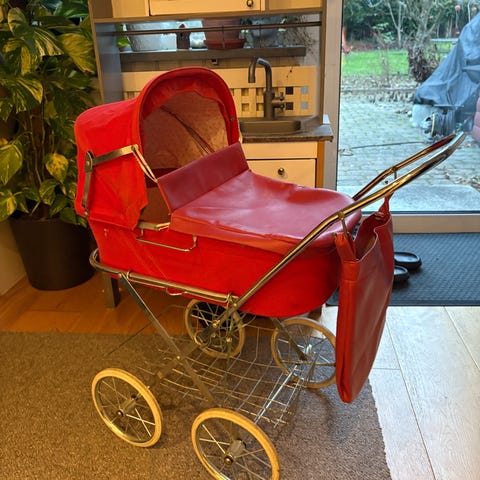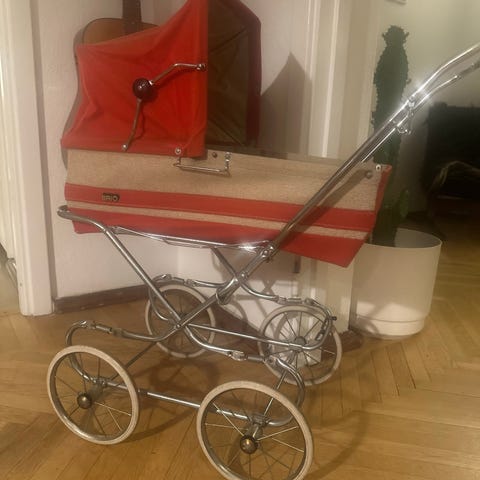 Dockvagn i retrostil i vit färg. Vagnen har metallstativ med böjt handtag och fyra fasta hjul. Liggdelen är i hårt material med enkel sufflett . Ganska bra skick, sufflett delvis torkad och trasig. Avhämtas. Märsta