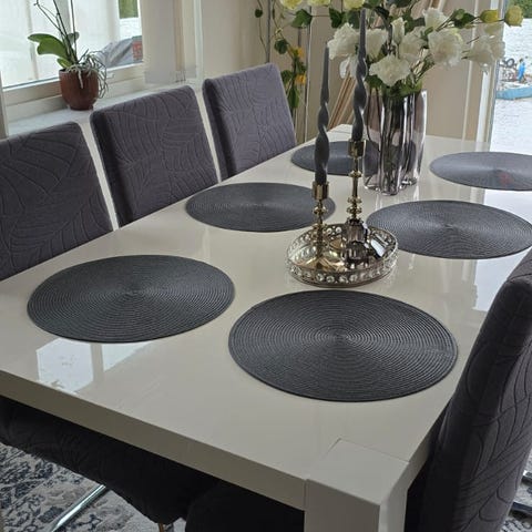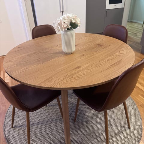 Bord och stolar från Mio, inköpt för många år sedan. Med förlängningsskiva. I ek om jag minns rätt. Rejält. Bordsskivan ommålad i vitt en gång. Slitage finns. Stolarna omklädda i möbeltyg. En sits lös men kan skruvas fast. Mått cirka 120×80 utan förlängningsskivan.