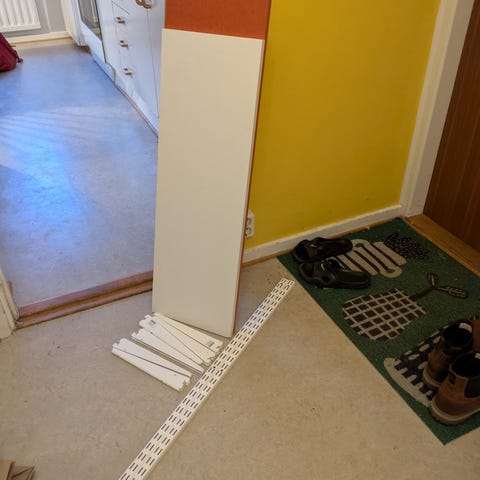 Inga skruvhål i hyllplanen, har bara lagt dom löst ovanpå konsolerna. Den kortare hyllplanet är vitare i färgen.