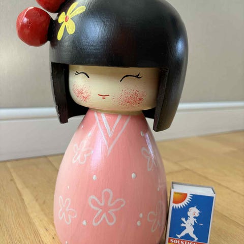 Japansk geisha prydnadsdocka med vagn i trä och textil