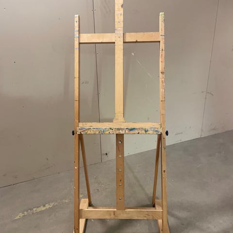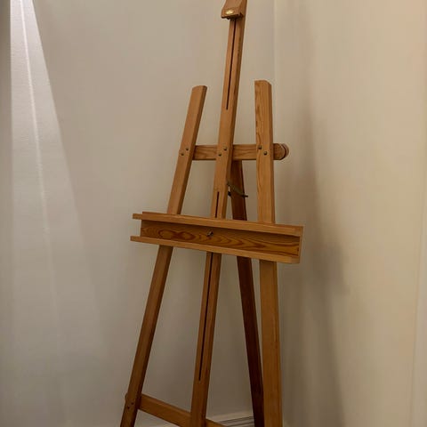 Staffli i trä, golvmodell med justerbar höjd och dukhållare. Passar för målardukar i olika storlekar och kan fällas ihop för enklare förvaring. Lämpligt för målning, teckning och presentationer i hem, ateljé eller skola.