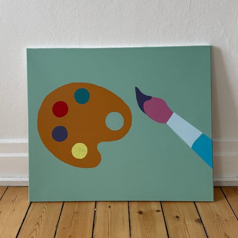 Tavla med motiv av en stiliserad regnbåge i flera färger mot ljus bakgrund. Kvadratisk form, lämplig att hänga på vägg i exempelvis vardagsrum, hall eller barnrum. Målad på duk uppspänd på kilram, kan hängas direkt på vägg utan ytterligare inramning. 45 x 39 cm