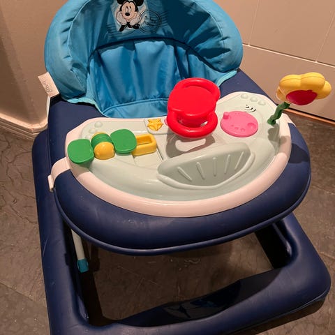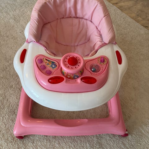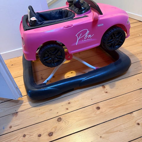 Gåstol i bilmodell i rosa färg. Sits med ryggstöd och leksakspanel framtill. Utrustad med hjul och underrede som kan användas som gungfunktion. Anpassad för små barn som håller på att lära sig gå, med stabil ram och plastmaterial som är lätt att rengöra. Produkten är som ny.