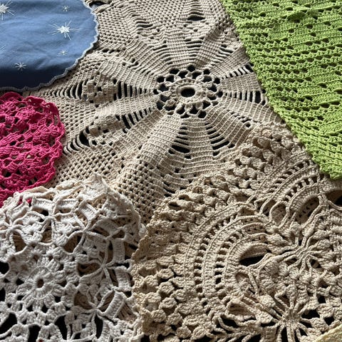 Sex stycken hemvirkade dukar, virkade under 70-talet och 80-talet.