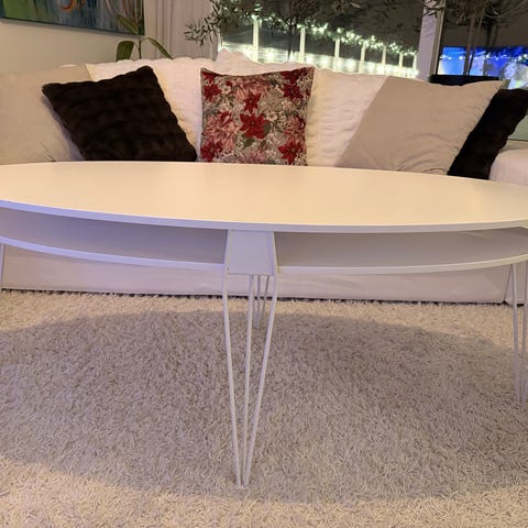 Ovalt soffbord i massiv ek med underhylla. Bordsskivan har synlig trästruktur och står på fyra lätt utsvängda ben. Underhyllan ger extra avställningsyta för till exempel tidningar eller fjärrkontroller. Bordet är i gott skick men som framgår av bilderna är det några mindre ytliga fläckar på bordsskivan.